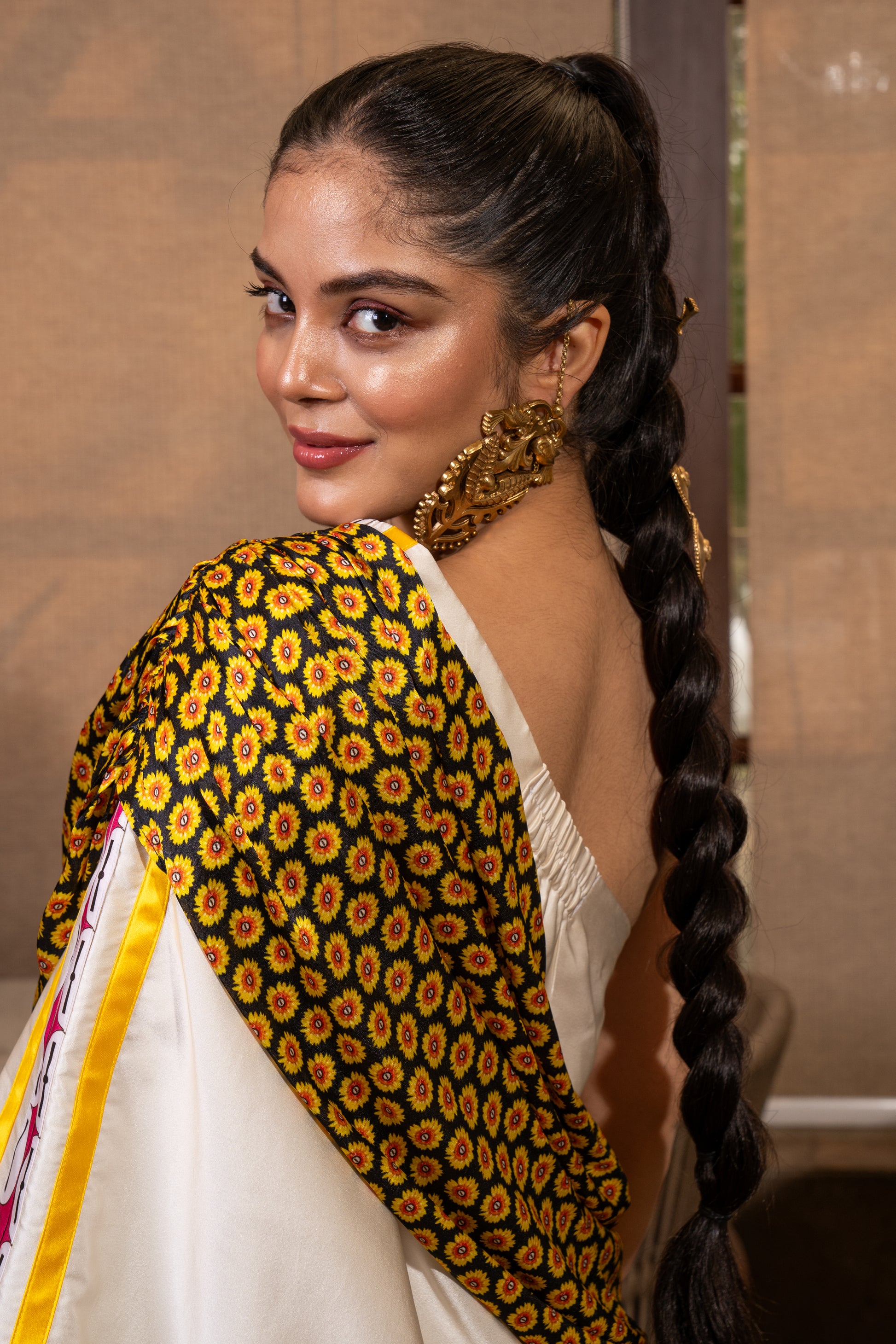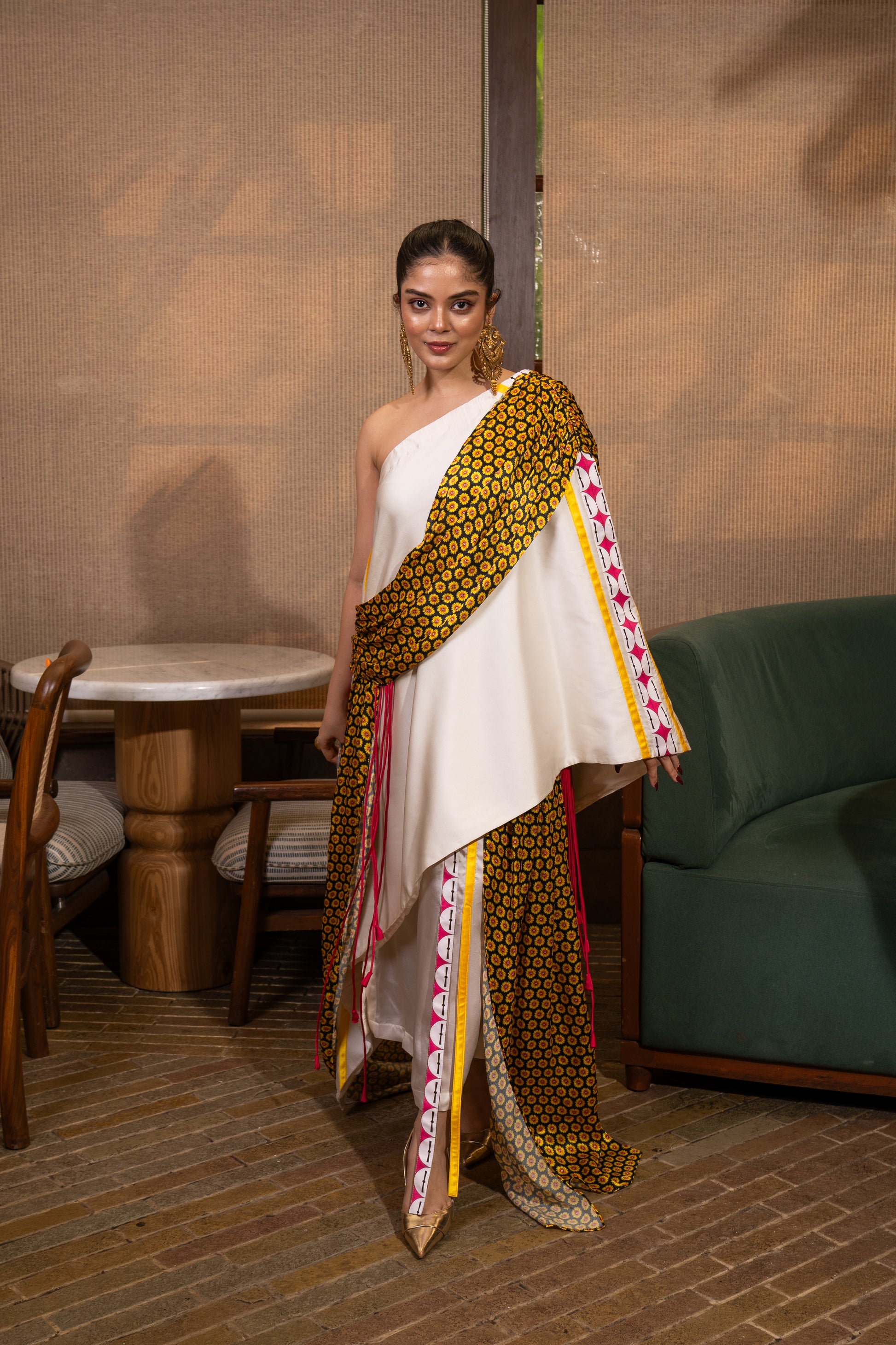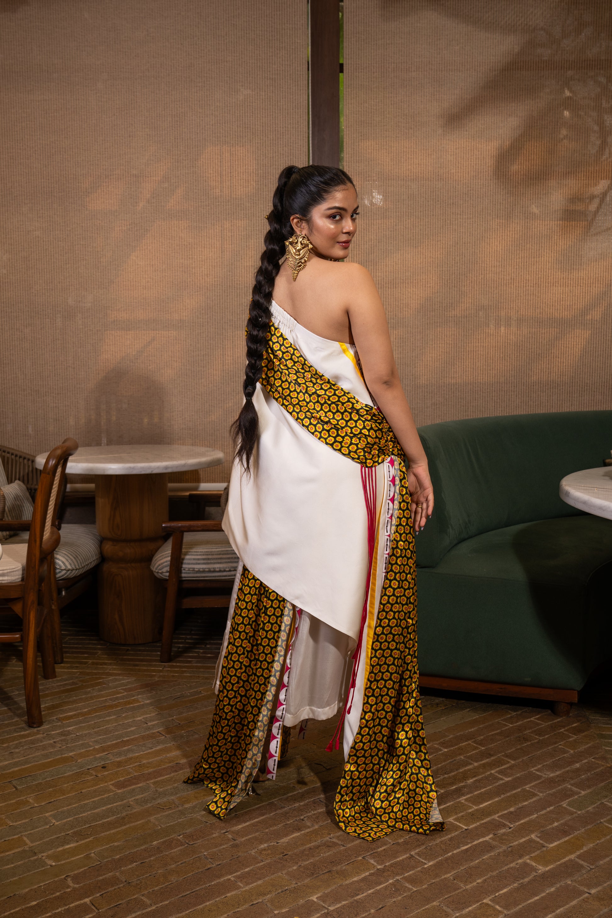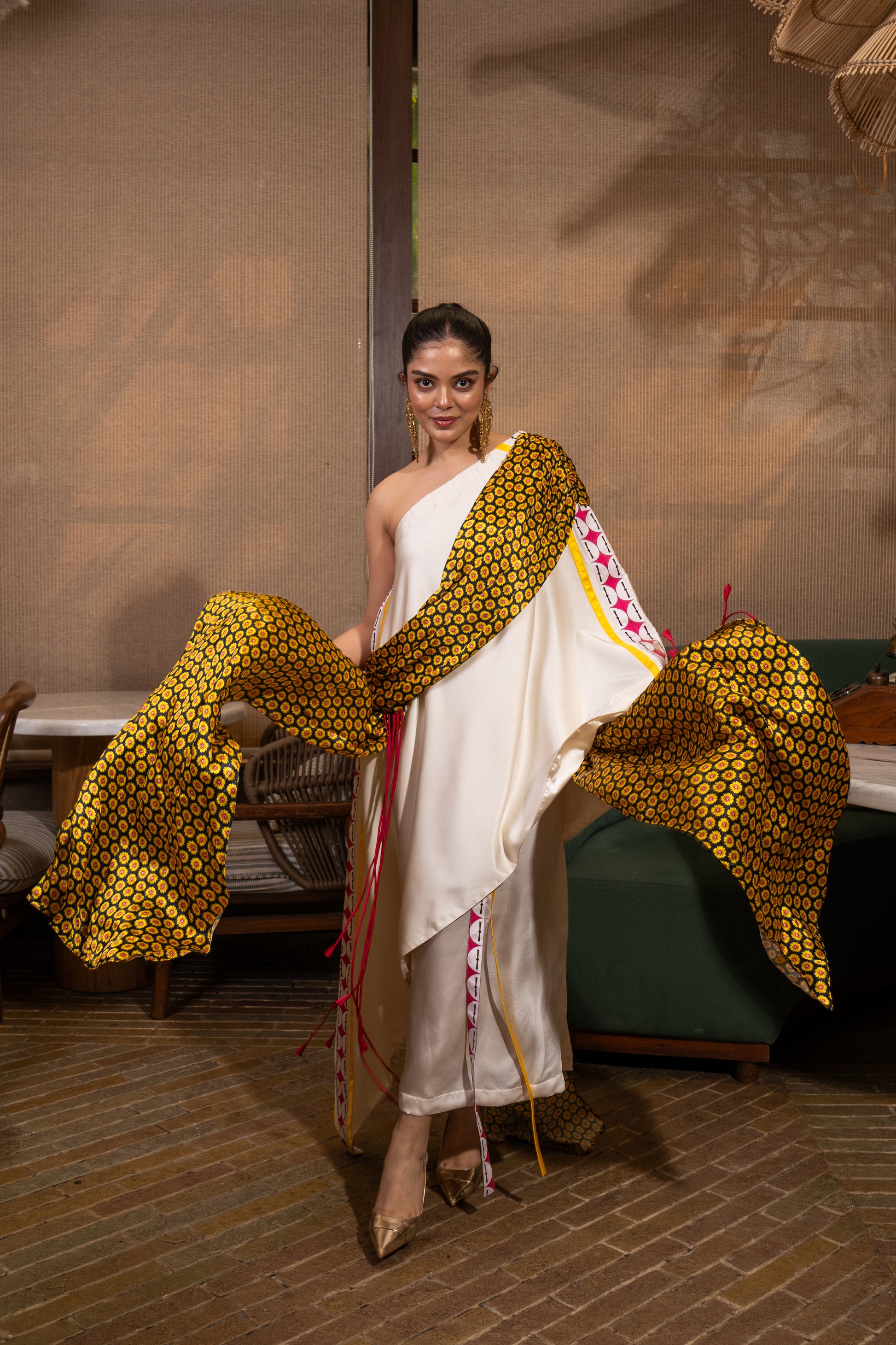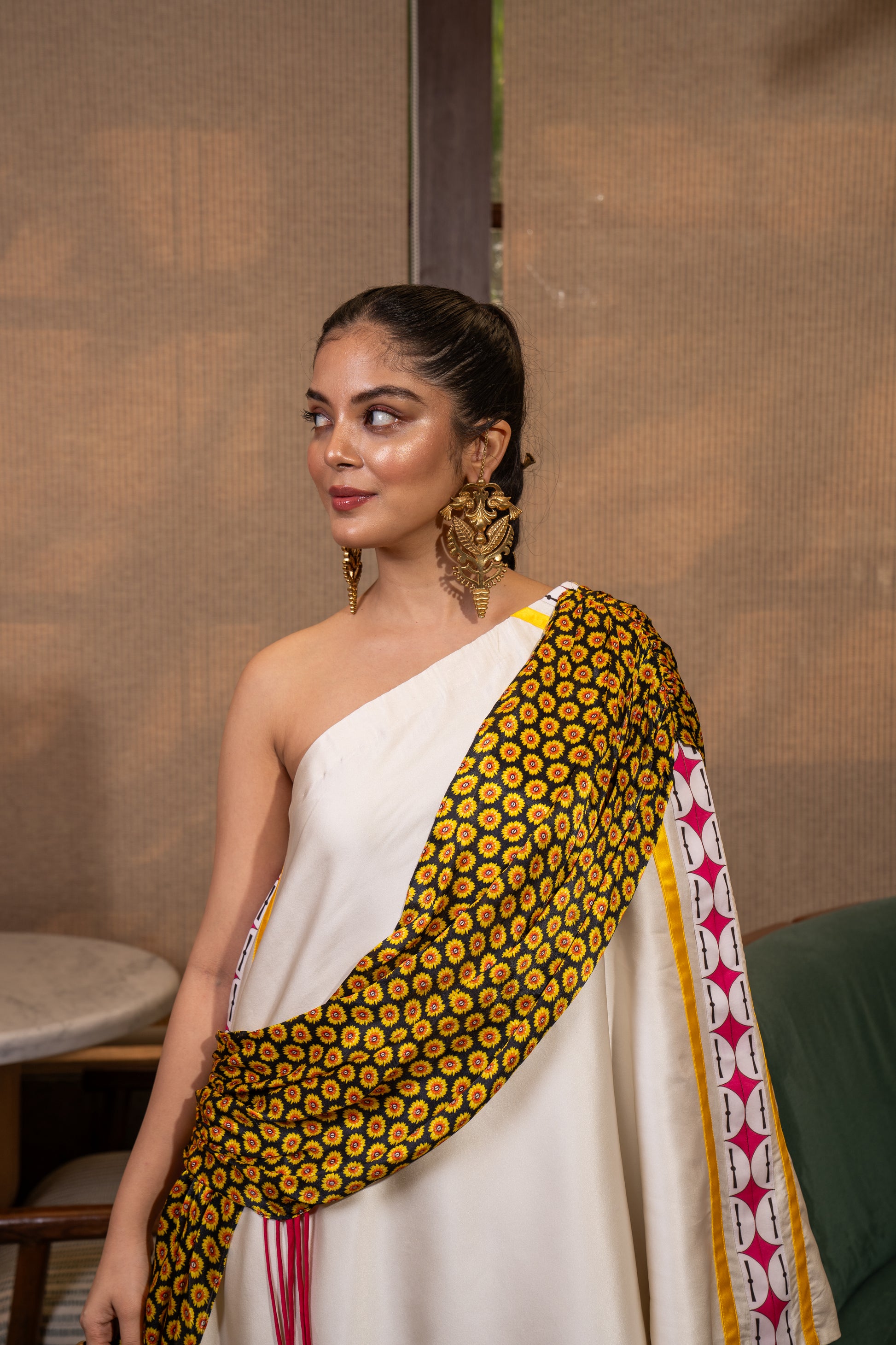 A womenswear ensemble; customised scallop logo and contrast colour edgings; gathered cross drapes printed with futuristic logo florals create the illusion of a saree and its flare; finished with corded tassel suspensions. Half elasticated and half dori waistbands facilitate easy wear and comfort for the skirt.