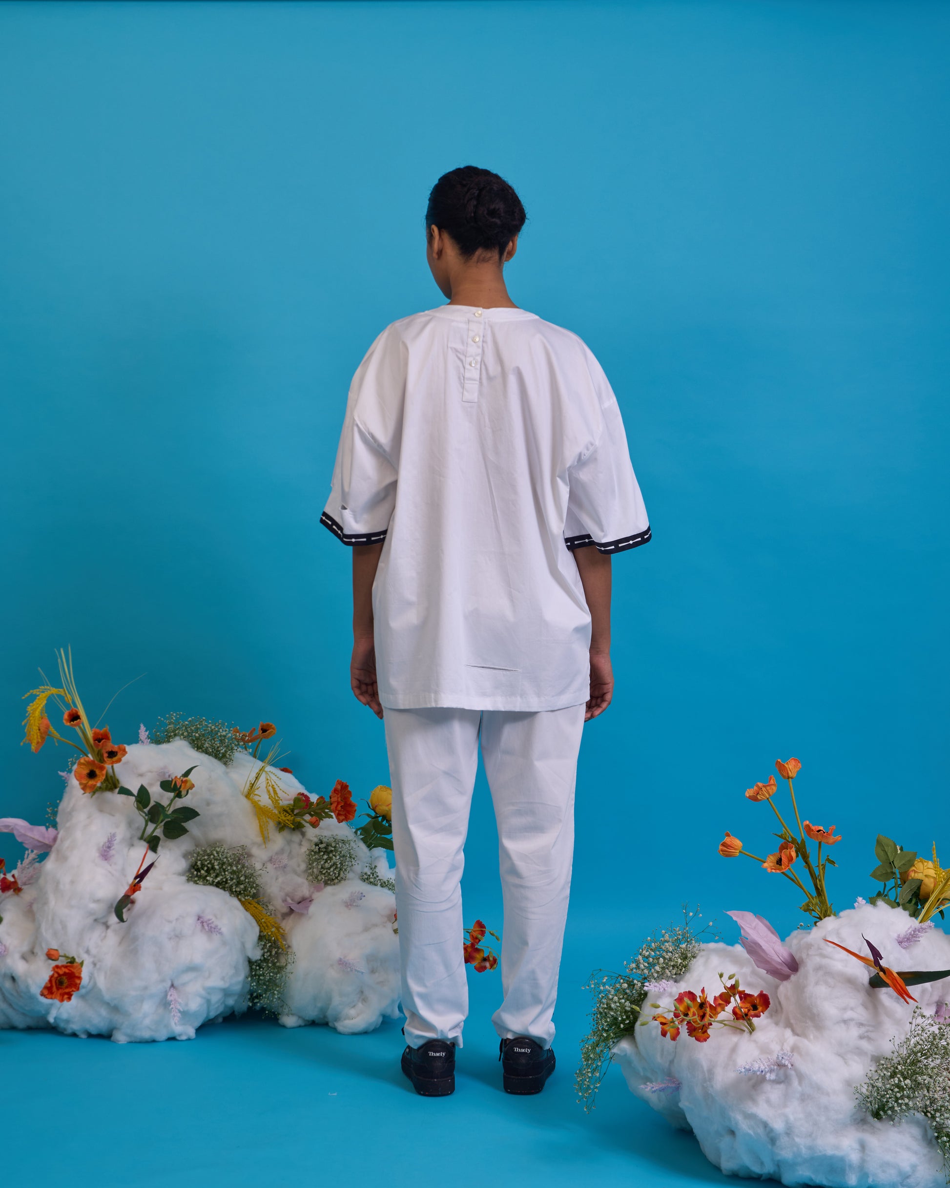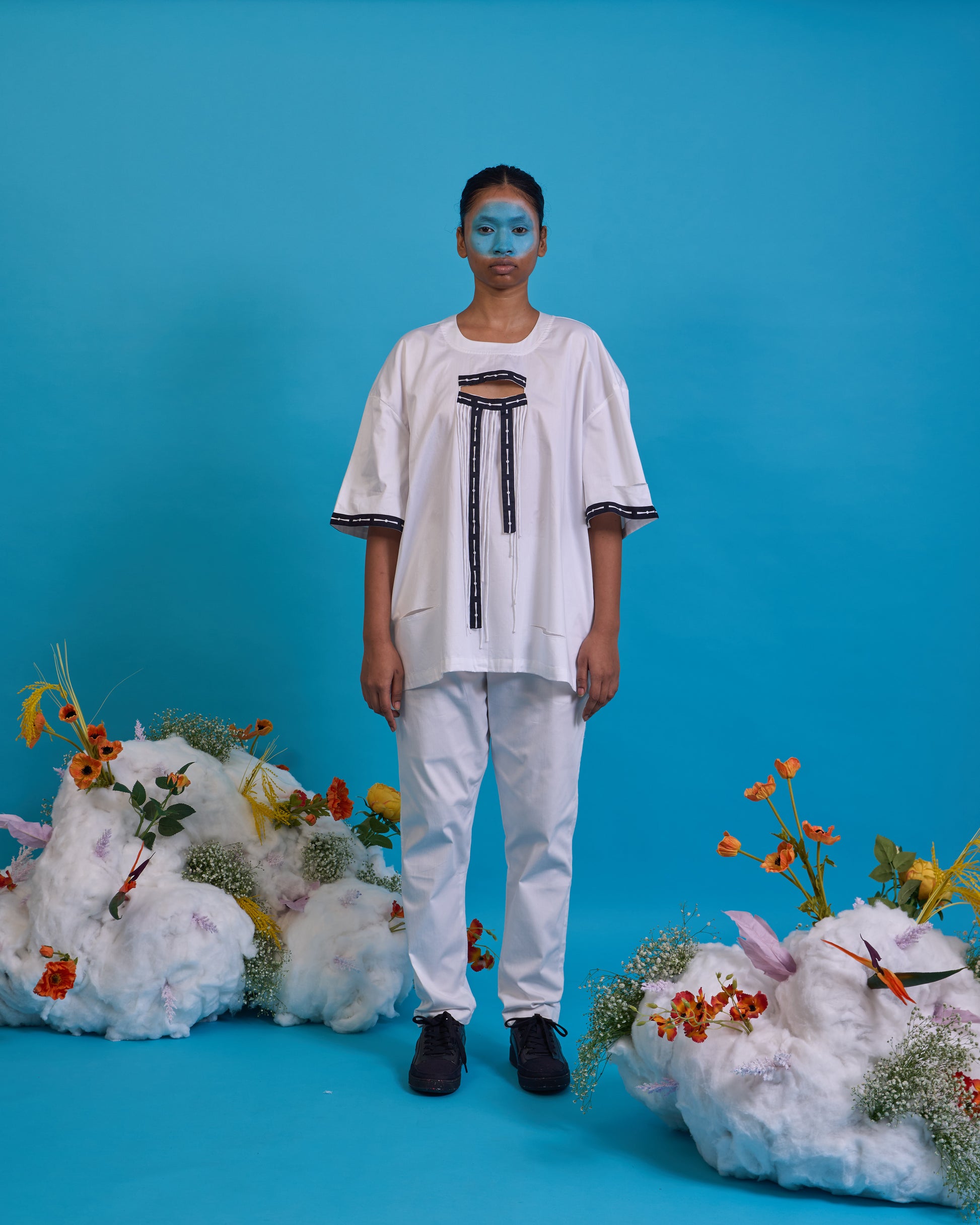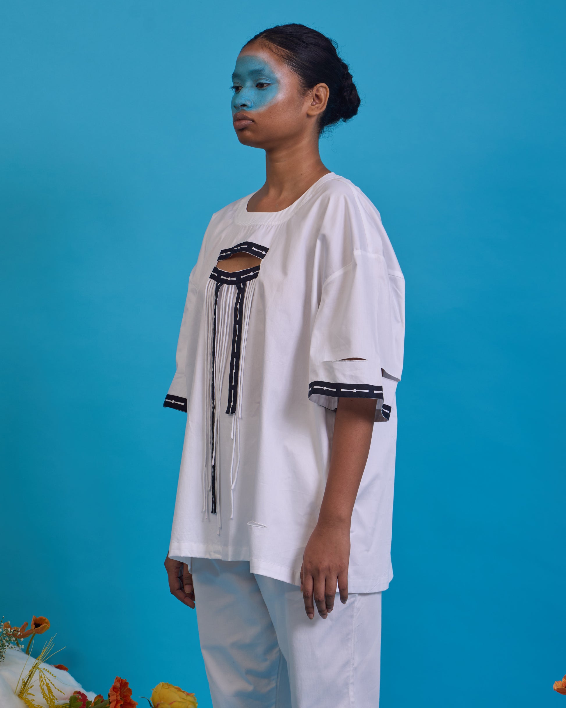 A unisex T-shirt; a central cut out slit along with customized logo printed strips and cord suspensions make the new Saim India fringe. Additionally multiple cut out slits are distributed evenly around, with a back shirt placket opening.