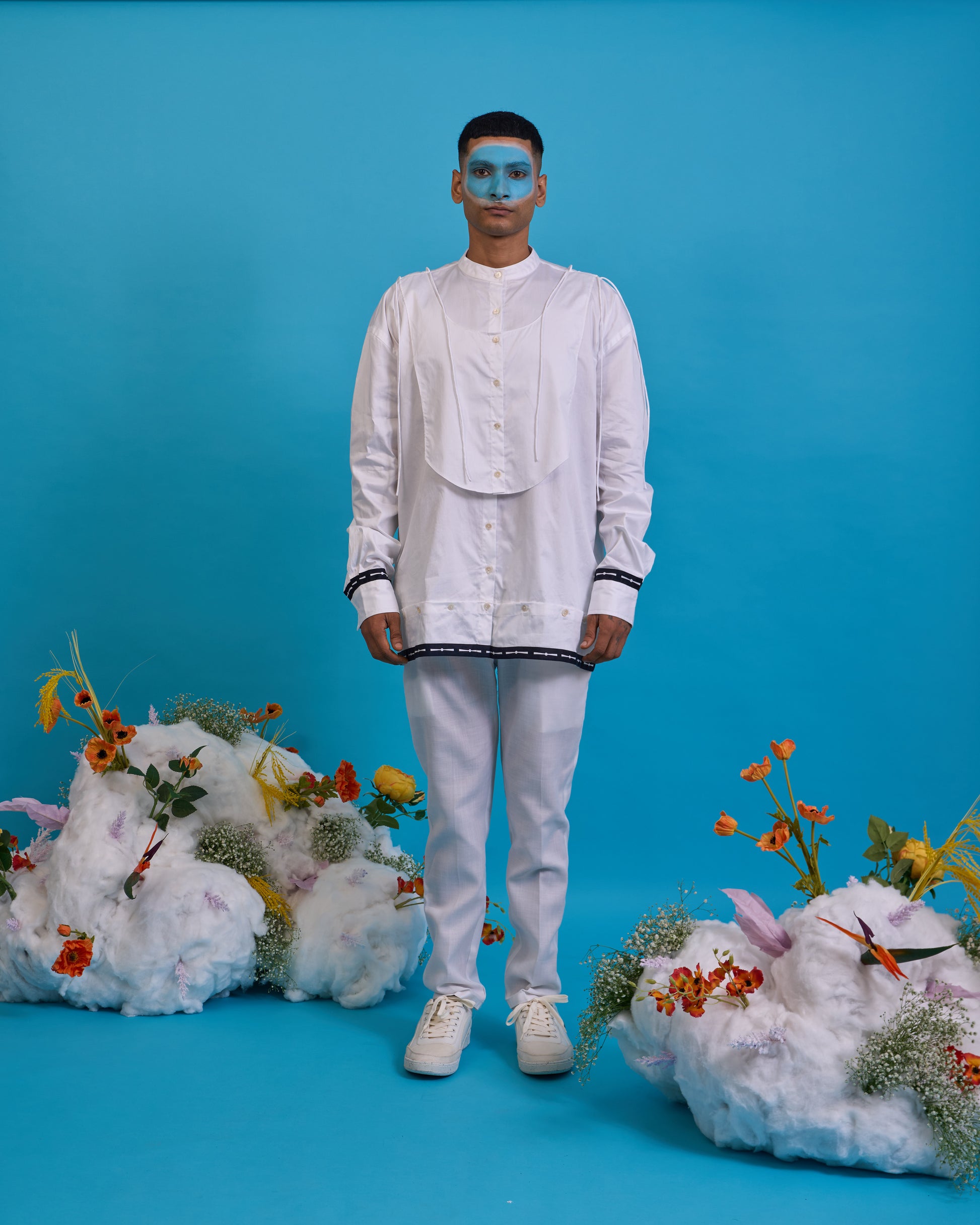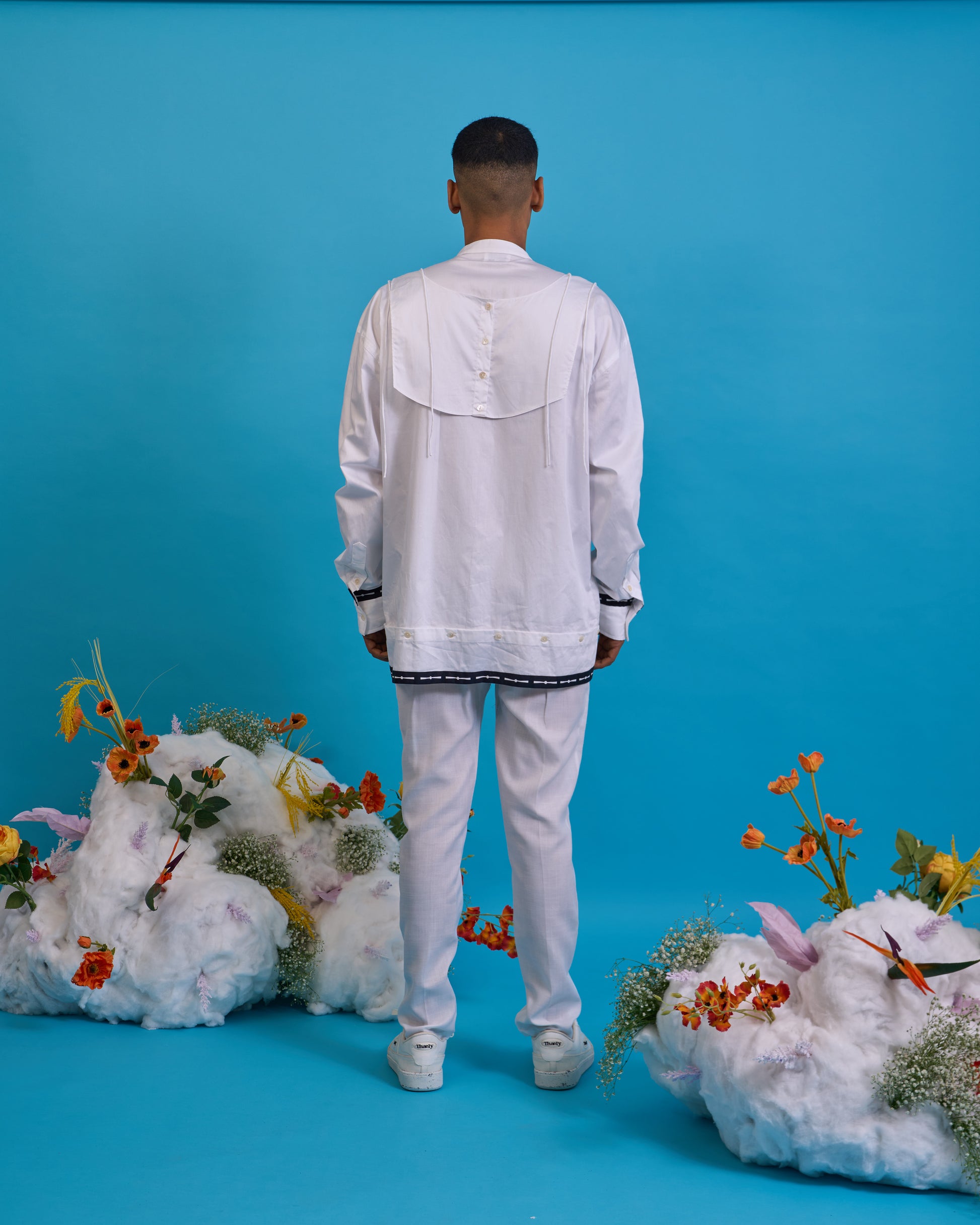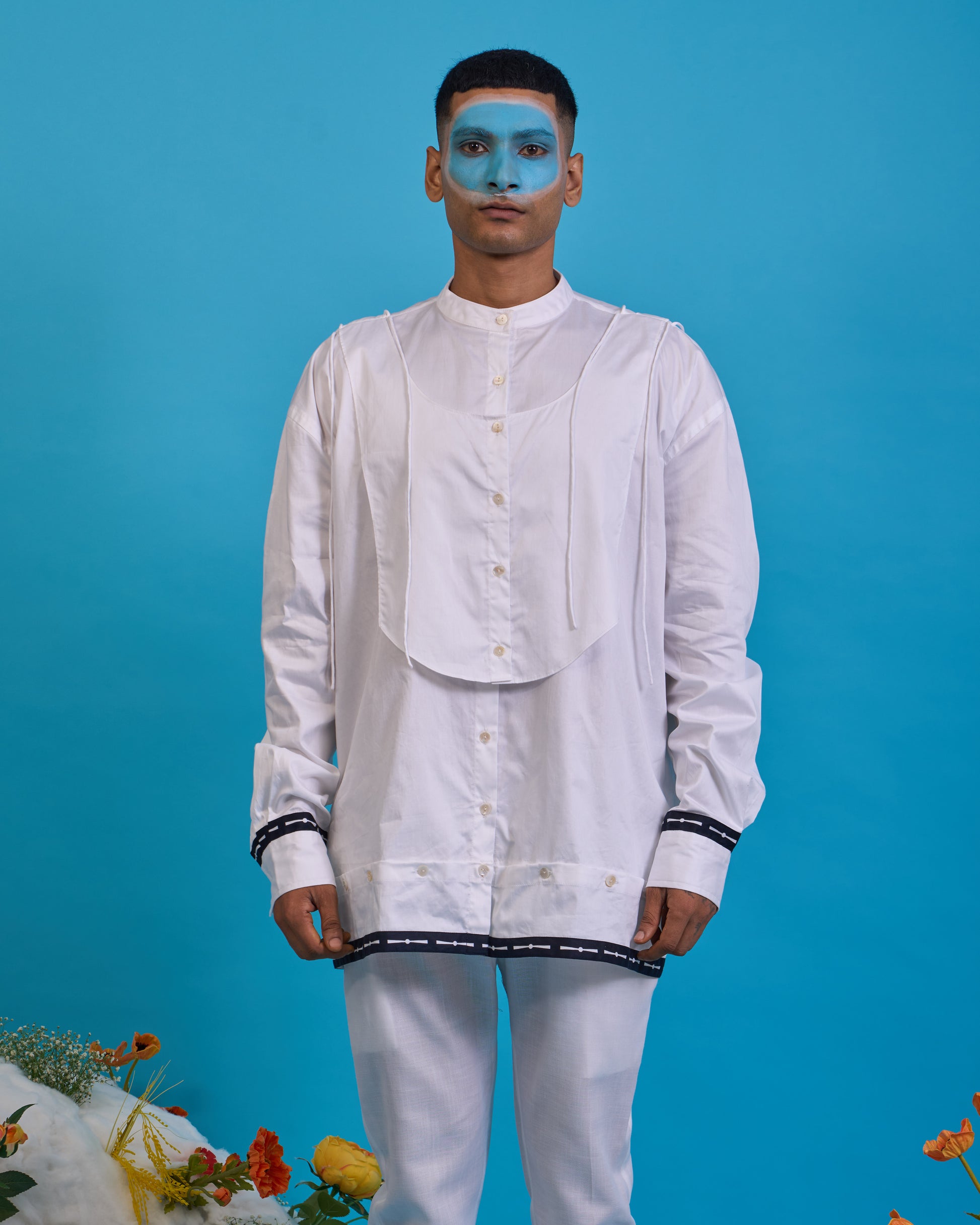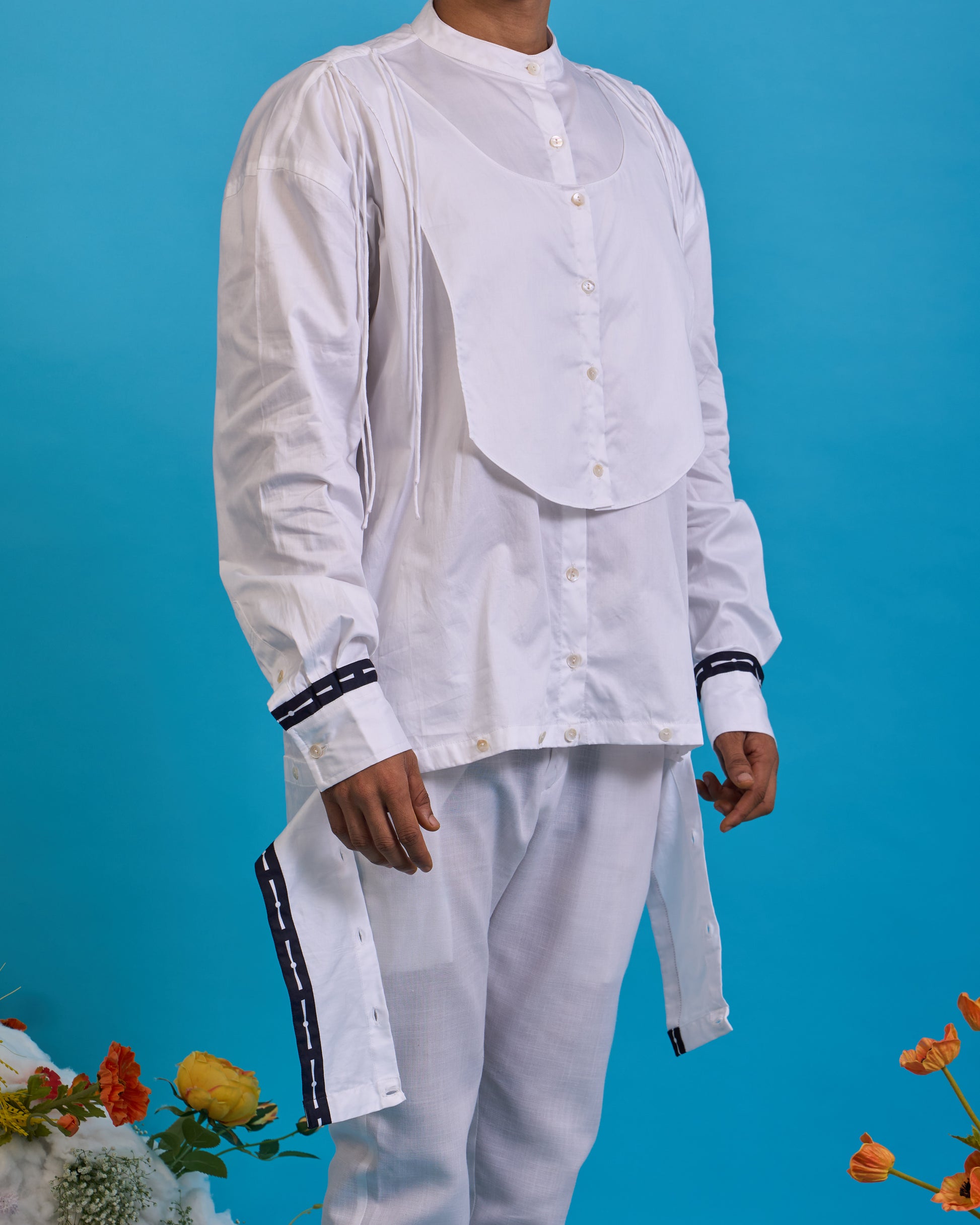 A unisex shirt, customized logo printed and functional buttoned hemlines, making the length alterable in multiple styled ways. The central front and back kurta yoke over layers button out for versatile style and comfort options, along with cord suspensions on either shoulder.