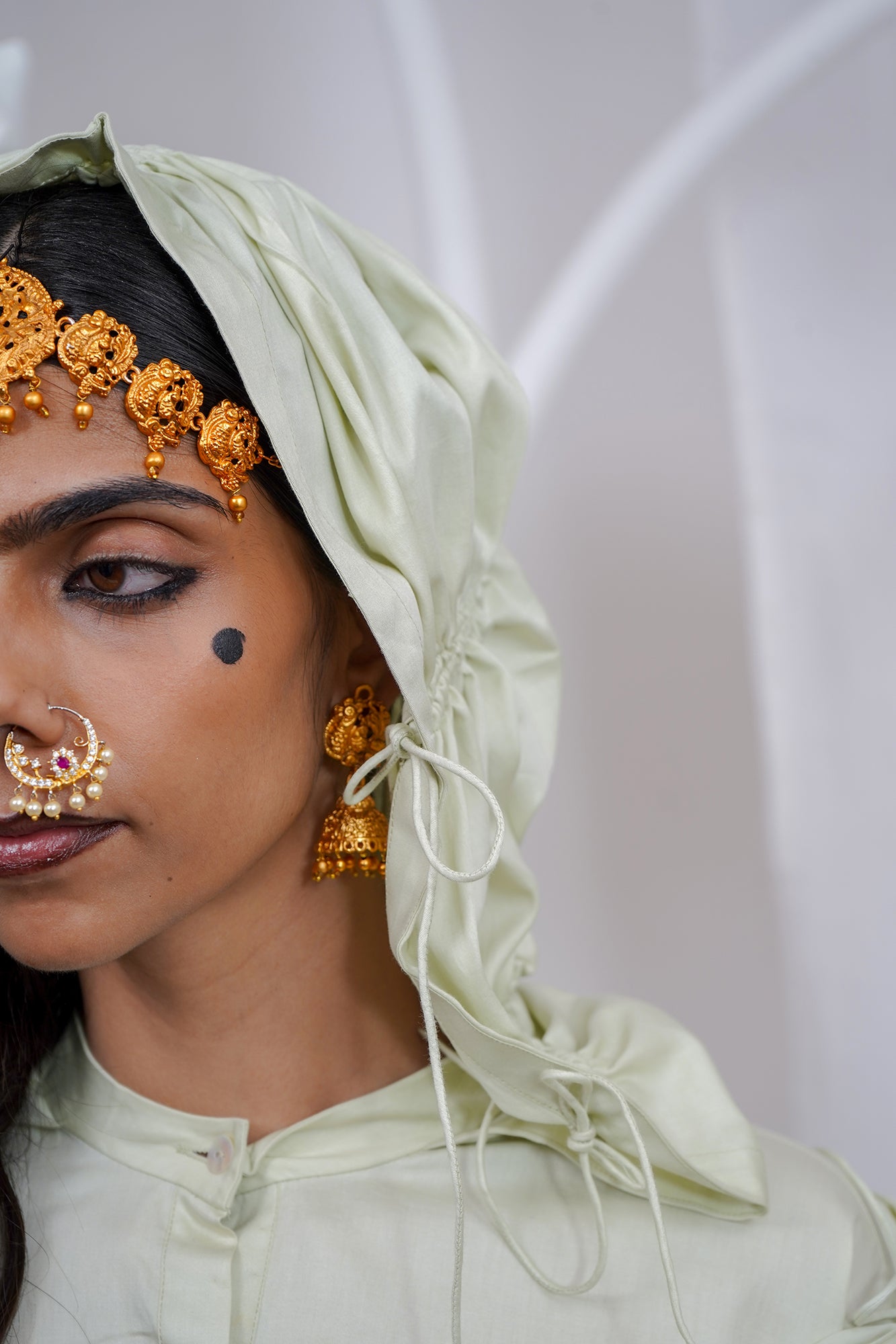 A unisex ensemble, adjustable draw stringed churi sleeve kurta with a big adjustable hoodie, or ghoonghat as we call it, with draw strings for your desired size and style; wear it or let it just dramatically hang. The pants come with functional side cowl pockets, a half elasticated and half adjustable dori waistband for easy wear and comfort. Additionally a draw stringed dupatta that can be adjusted to achieve your desired drape style. At Saim India we call this a fun take on the Indian traditional salwar - kameez set.