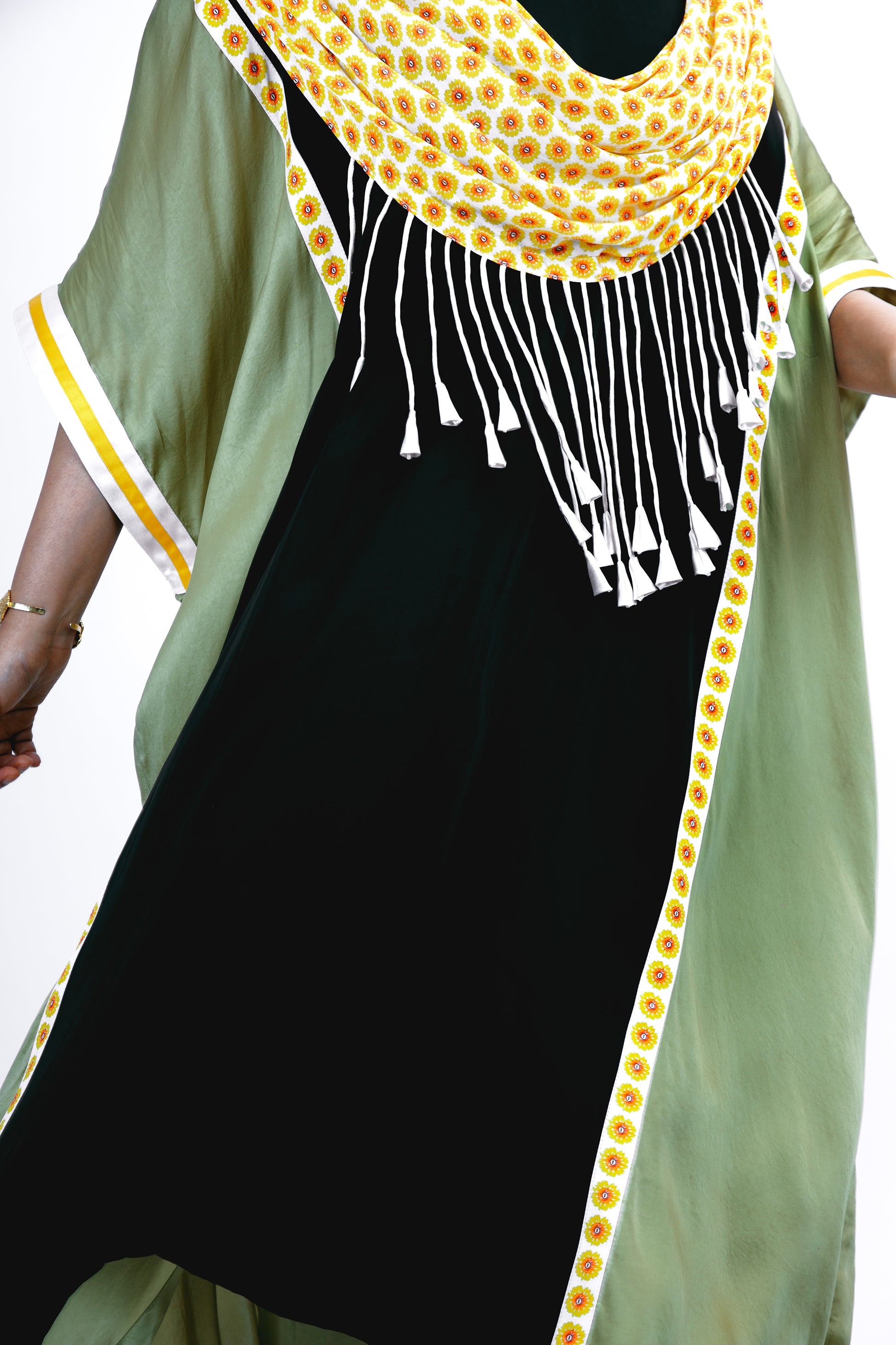 A womenswear ensemble, custom sunflower print drape finished with tasseled suspensions mimic the traditional Indian dupatta; contrast sporty hemline details and borders. Half elasticated and half dori waistbands facilitate easy wear and comfort for the trouser, which features a side slit detail.