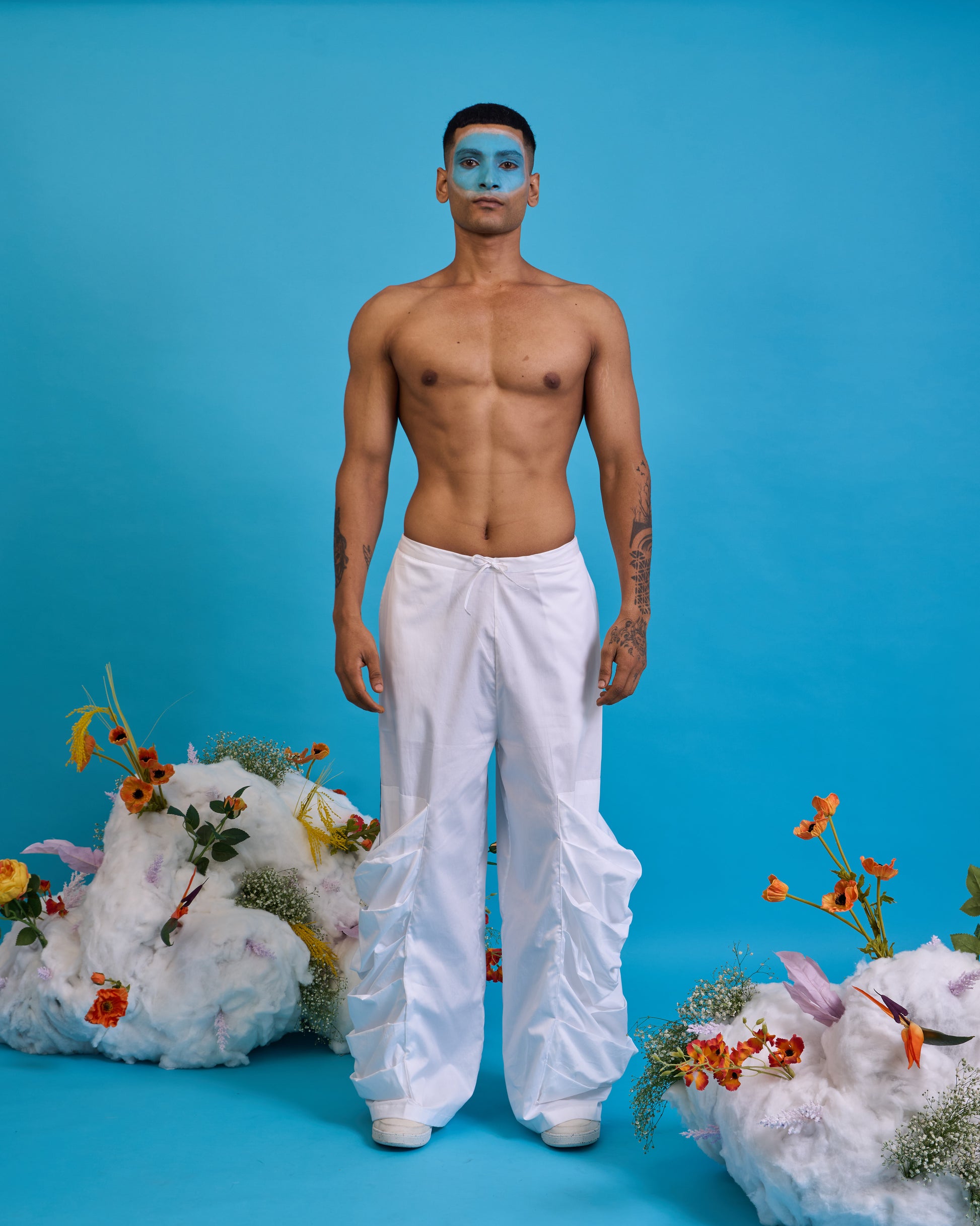 A unisex trouser; functional cowl pockets on either side with contrast stripped details, half elasticated and half dori waistbands to facilitate easy wear and comfort.