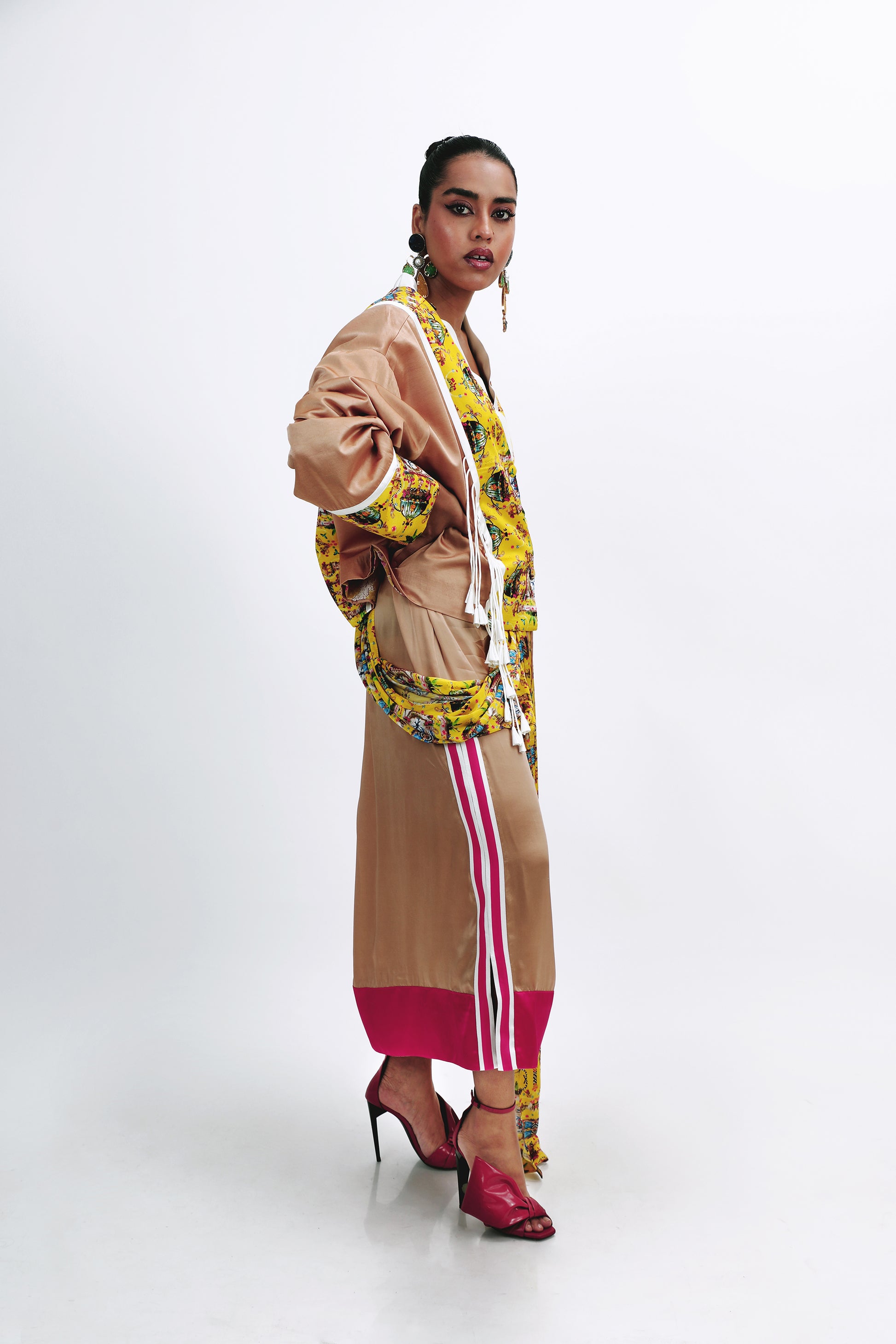 A womenswear ensemble; India inspired monumental print drapes, yokes and details finished with tasseled suspensions. Half elasticated and half dori waistbands facilitate easy wear and comfort for the skirt, which features contrast colour detail side slits.